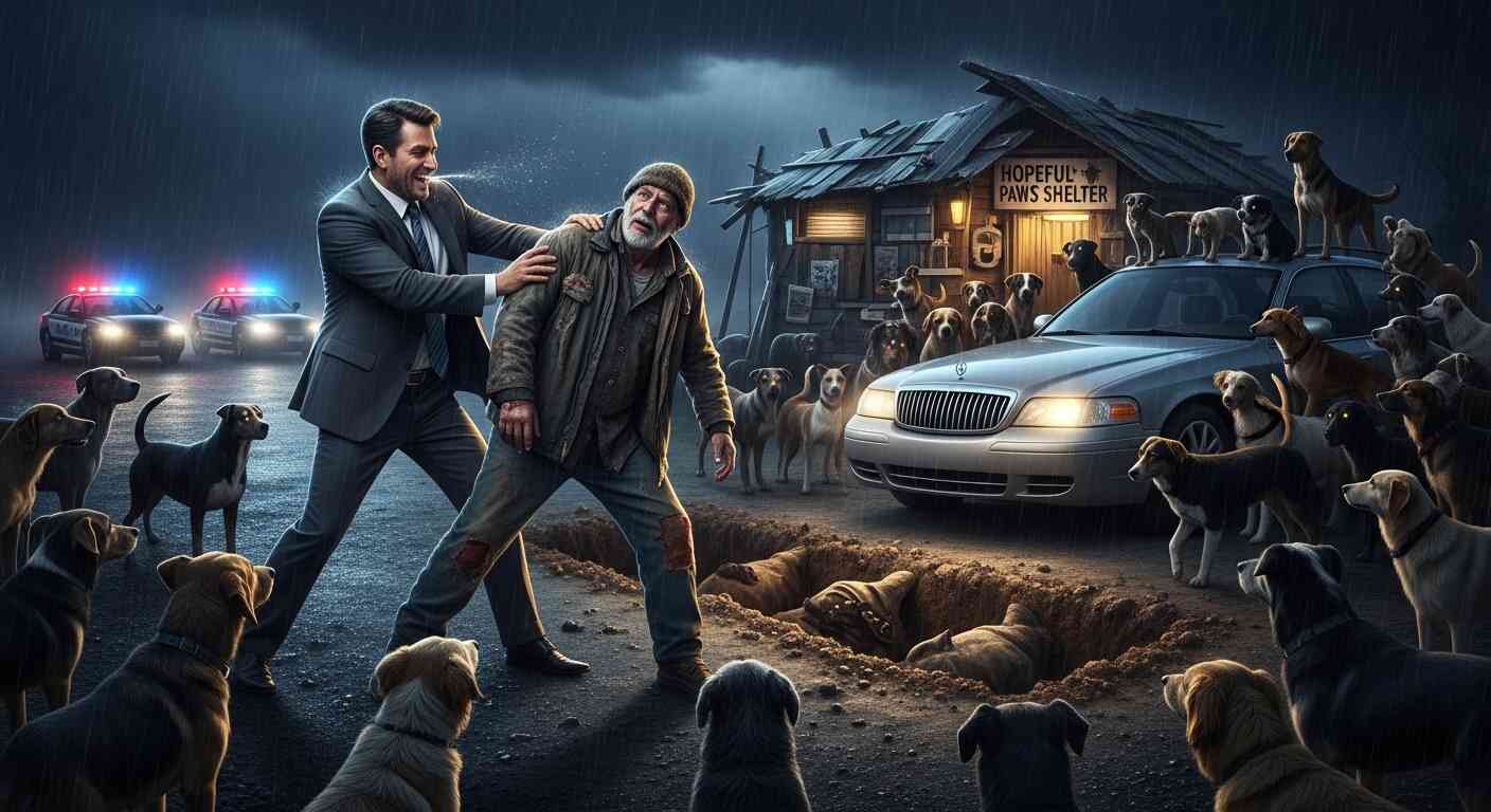 Sterling had emerged from his SUV, a submachine gun in his hands. He wasn’t the billionaire developer anymore. He was a cornered rat. “I’ll kill them all! I’ll burn this whole ranch to the ground before I let a hobo and his mutts take me down!”