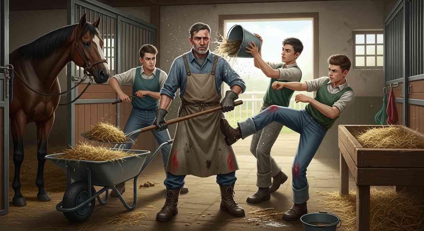 The other grooms gathered around, sensing blood. They began to jeer, emboldened by Bryce’s rage. One of them stepped forward and kicked Elias’s legs out from under him. Another threw a bucket of soapy water over his back.