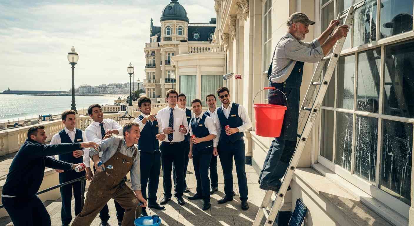 His bucket clattered, soapy water spilling everywhere. The laughter was deafening.