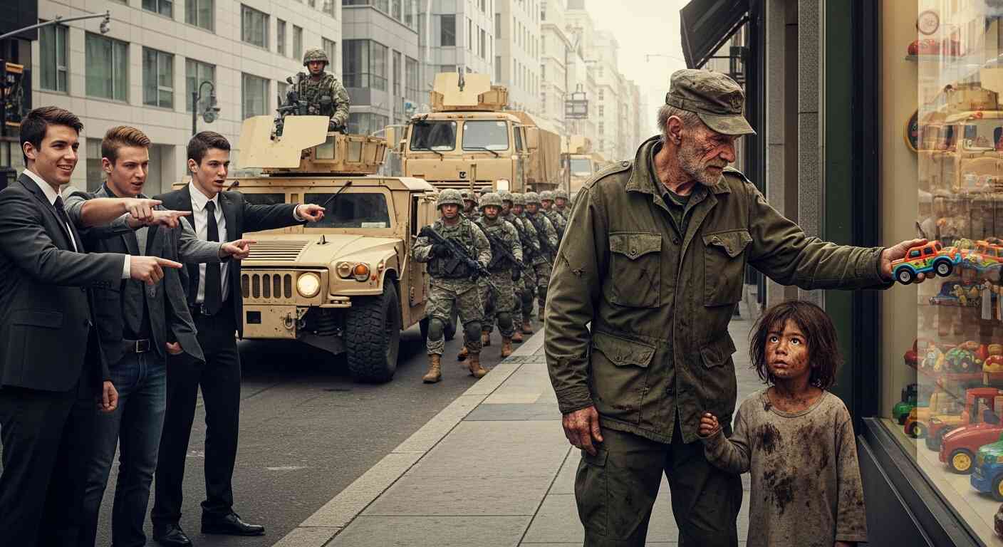 A young Major with three rows of medals on his chest marched straight into the center of the circle. He didn’t look at the “bum” with disgust. Instead, his eyes welled with tears.