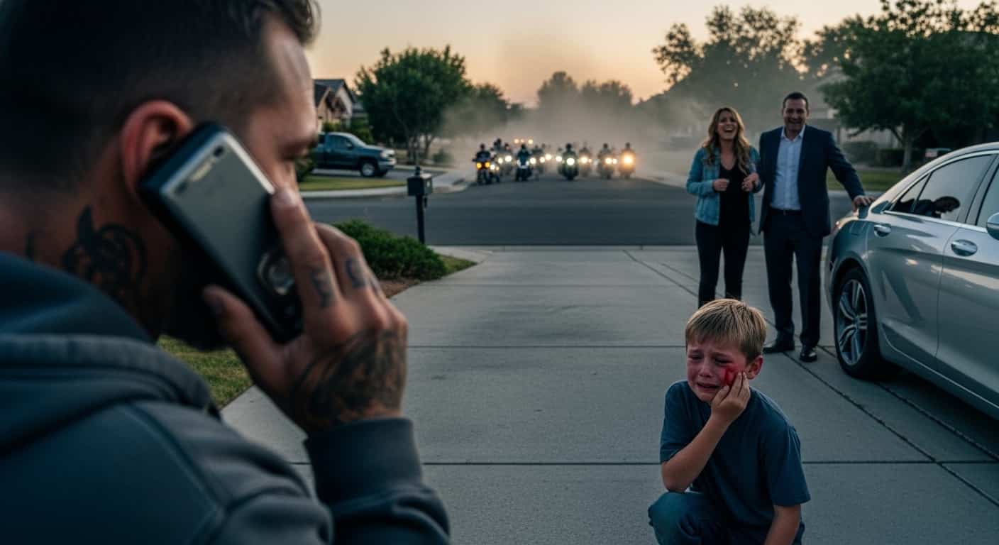“”Get up,”” I said, grabbing him by the collar and hauling him to his feet. I leaned in close, so close he could smell the old leather and the cold rage radiating off me. “”I want you to listen very carefully. You’re going to walk out of this neighborhood. You’re not going to call the police. You’re not going to call your ‘friends.’ Because if I see a blue light in this cul-de-sac, my brothers won’t just break your car. They’ll break every bone in your body, one by one, starting with the hand you used on my son.””