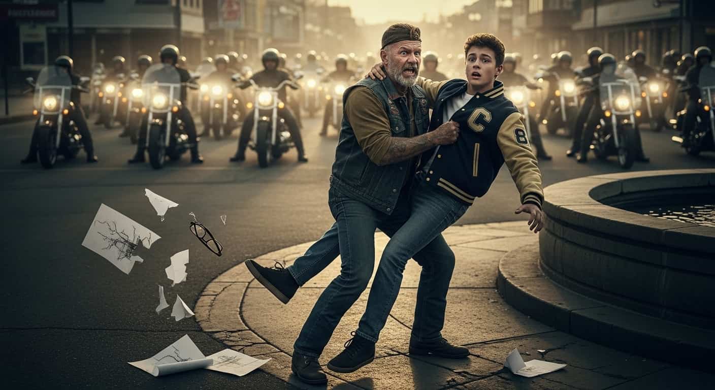 The first was a matte-black pickup truck, grill guarded and reinforced, trailing a cloud of dust as it hopped the curb and slid onto the grass of the square. Behind it came twenty motorcycles, riders clad in leather and denim, their faces hidden behind dark visors.