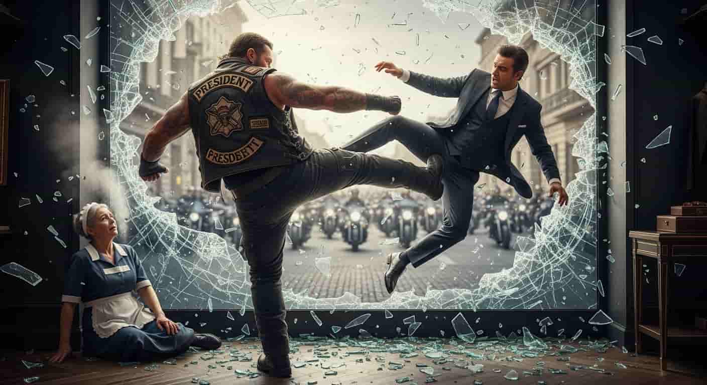 He didn’t run; he lunged. He was a predator in a room full of peacocks. Before Julian could even register the giant in the leather vest, Jax’s boot was buried in his sternum. The impact was cinematic. Julian was airborne, his body a projectile that shattered the massive front display window.
