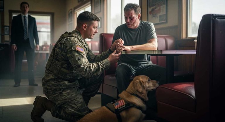 He spat on my service dog’s vest and called my scars “disgusting” in front of the whole restaurant. I just wanted a quiet cup of coffee, but he wanted a target. Then the door opened, a Four-Star General walked in, and the look of pure terror on that man’s face when the General knelt at my feet is something I’ll never forget. This wasn’t just a coincidence—it was a reckoning